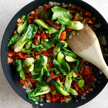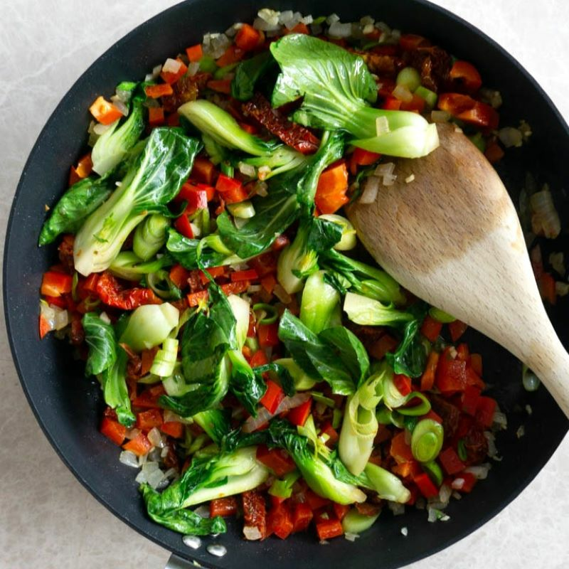 Del bok choy i biter på ca 2 cm og ha i panna sammen med løken til den faller litt sammen.