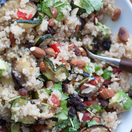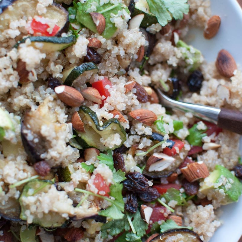 Bland quinoa, sitronsaft og stekte grønsaker. Ha over avokado, tomat, koriander, mynte, rosiner og mandler.