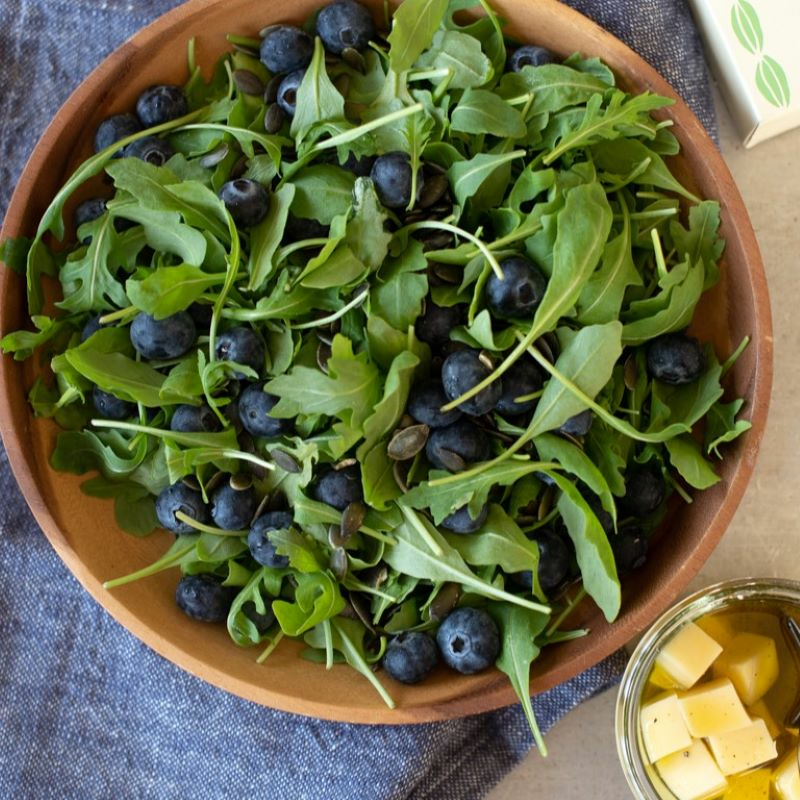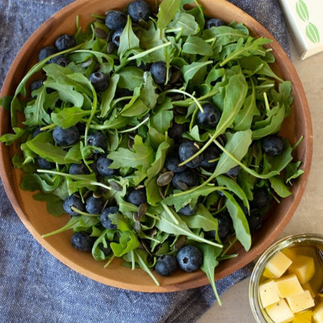 Ruccolasalat med blåbær, ost og gresskarkjerner