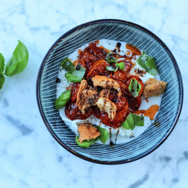Denne blandingen av varme tomater og iskald mozarella er uslåelig. Toppet med crunchy krutonger og frisk basilikum er dette en rett du både blir mett og glad av.