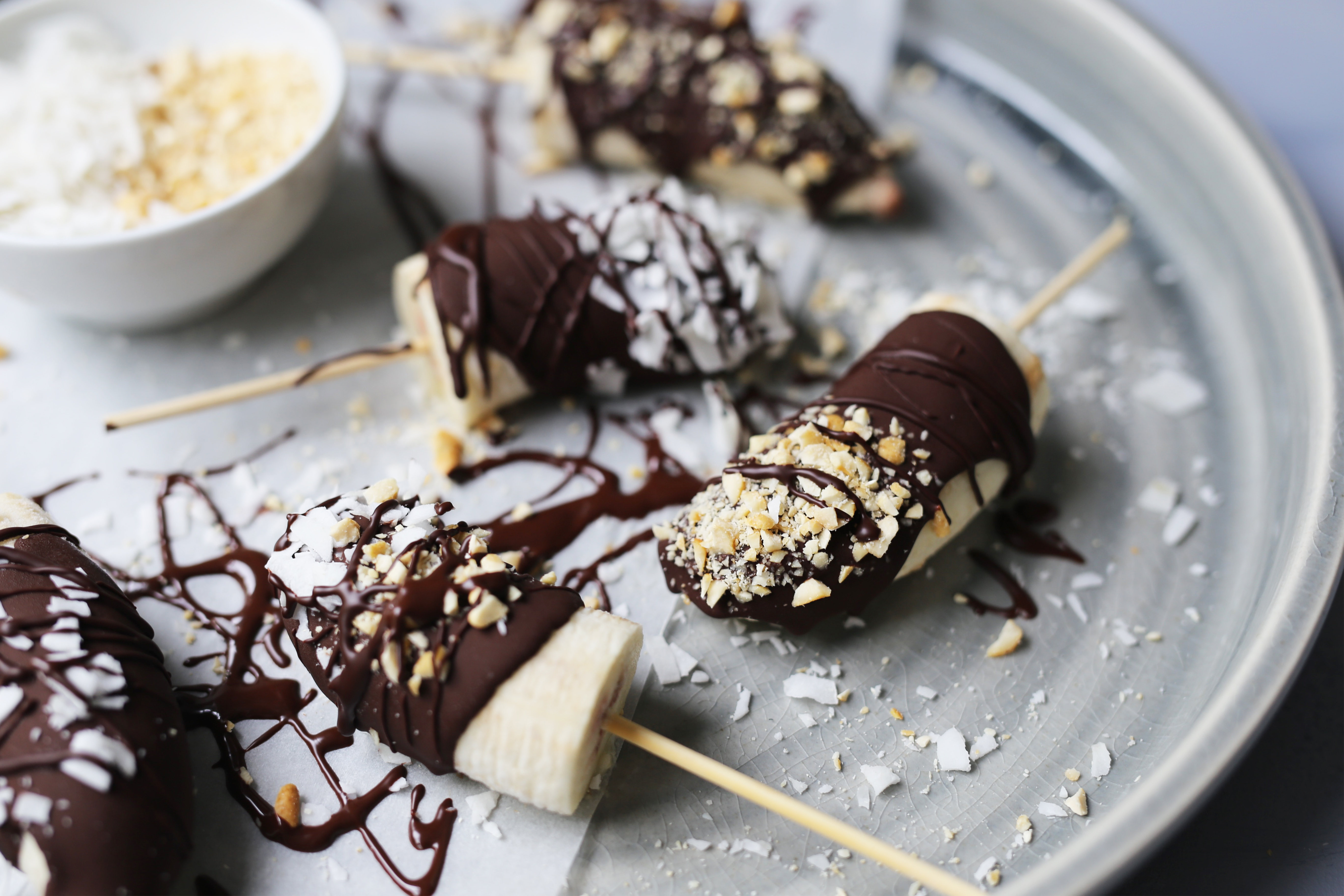 En sikkker vinner hos voksne og barn. Frys bananene og dypp i sjokolade, topp med nøtter og kokosflak.