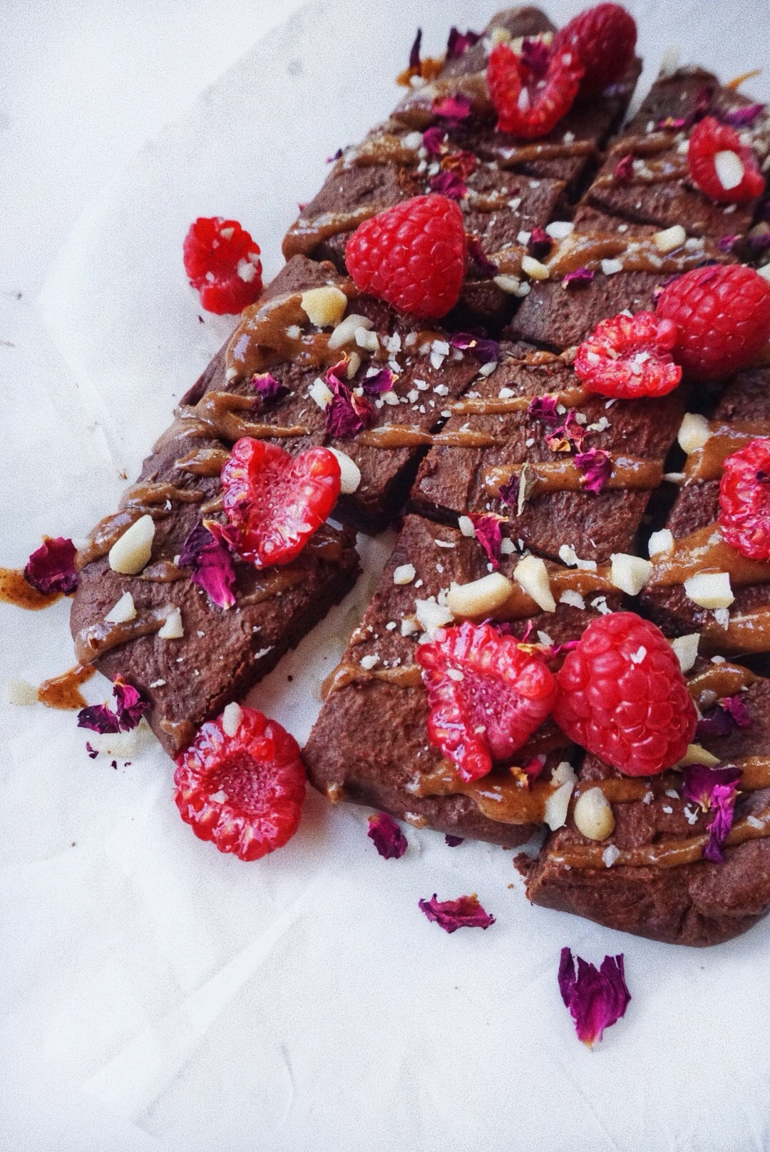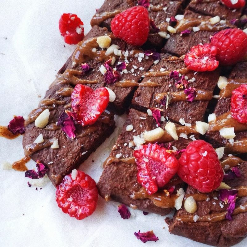 Hell karamellsausen over den stekte brownien sammen med noen bringebær og knuste nøtter.
