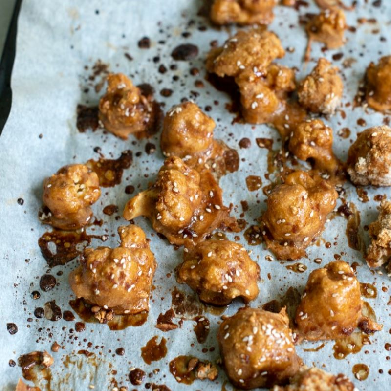 Dypp de ovnsbakte blomkålbukettene i røra, og legg tilbake på stekebrettet.