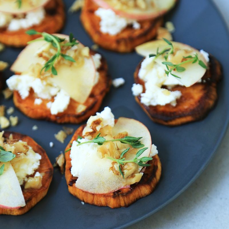 Imens søtpoteten står i ovnen renser og deler du eple i skiver, smuldrer fetaosten, grovhakker nøttene og timian.