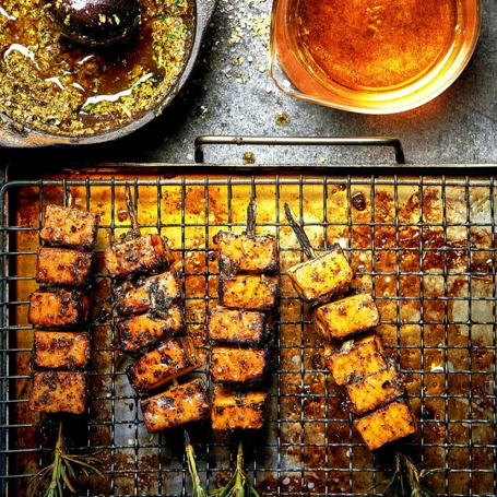 Grill tofu, først over høy varme, og legg det deretter til siden slik at det stekes på indirekte varme en stund.