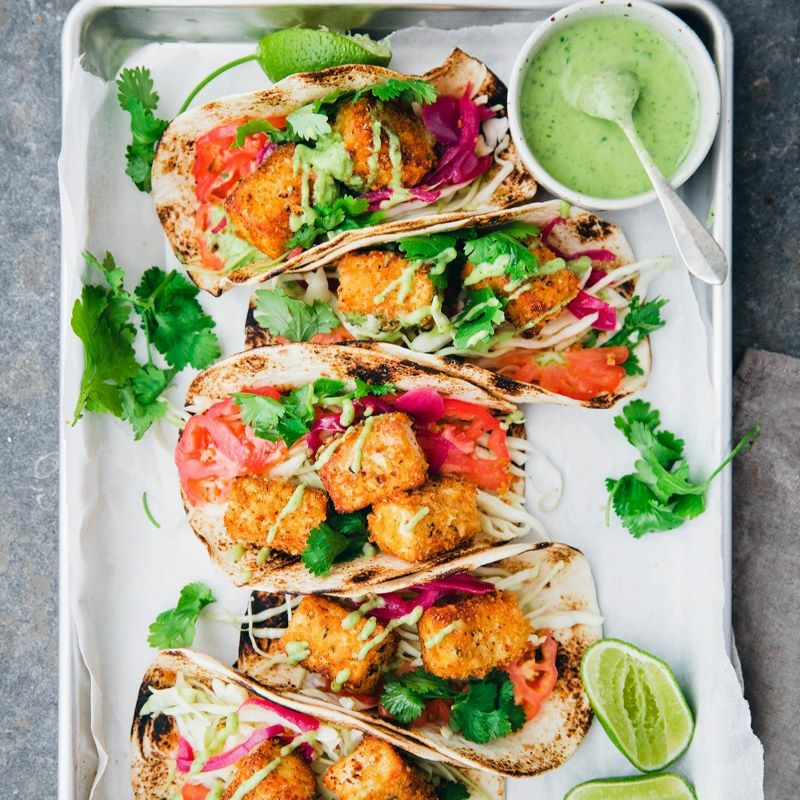 Hvis du panerer tofu i lime, soya og strøbrød så får du smakfulle, sprø biter som er perfekte å bruke i taco med avokado- og koriandersaus.