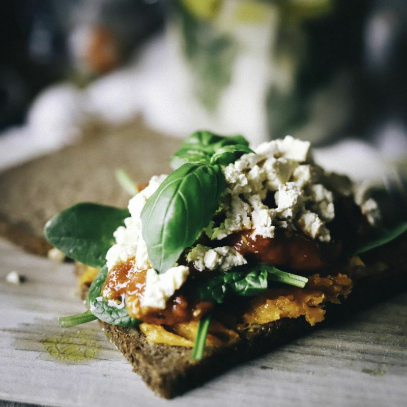 Legg tomater, spinat, tofu og basilikum også på brødet før du legger den andre brødskiven over.