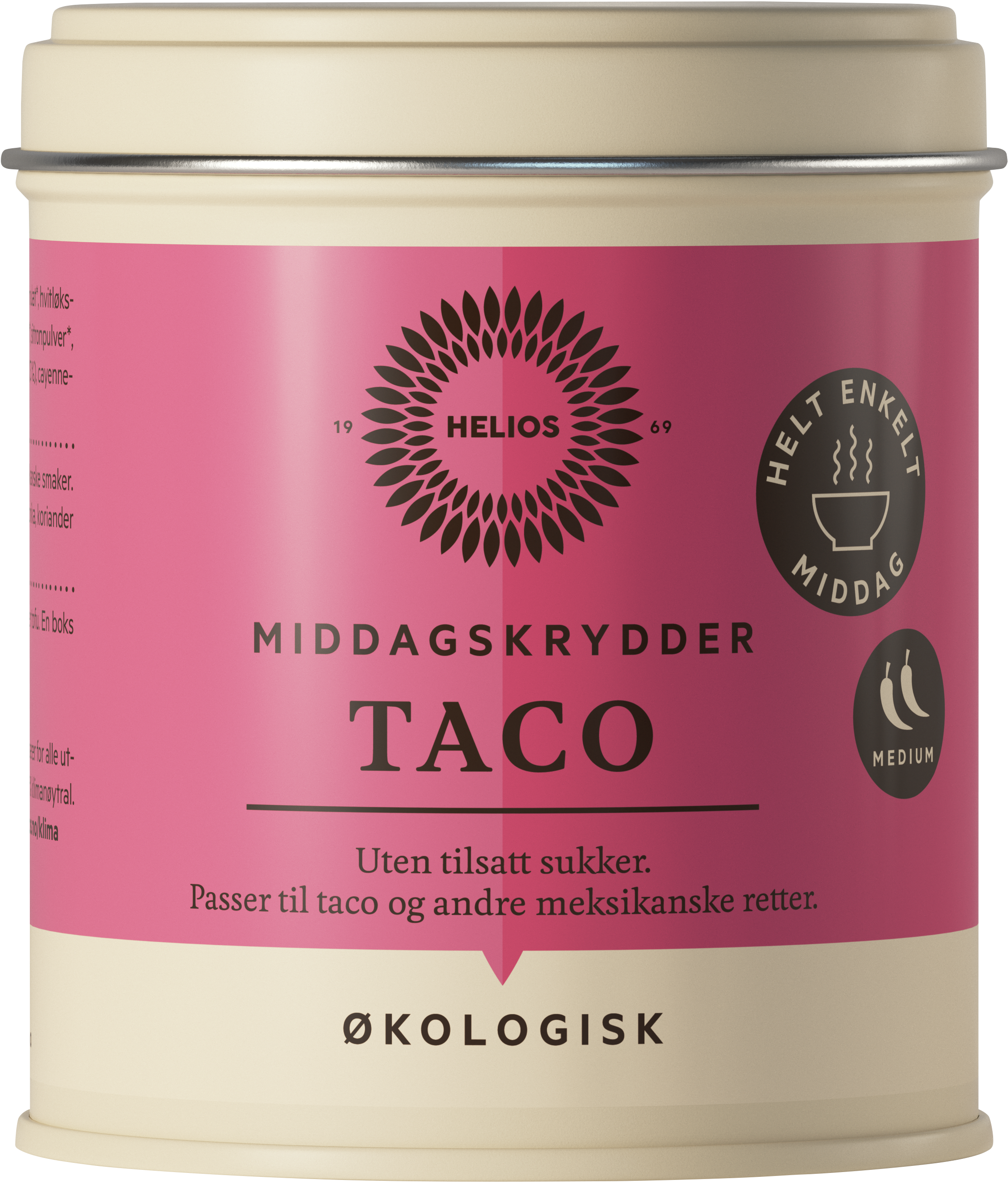 Helios Tacokrydder er et klassisk meksikansk tacokrydder med autentisk smak og gode, rene råvarer. Ikke tilsatt sukker og akkurat passe sterkt med ren, frisk smak av koriander, spisskummen og cayennepepper. Boksen inneholder 70 g.