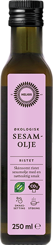 Helios Sesamolje er ren olje presset fra skånsomt ristede økologiske sesamfrø. Ristet sesamolje har en dyp, nøtteaktig smak og er en viktig ingrediens i det asiatiske kjøkkenet, blant annet i marinader, sauser og dressinger. Tåler varme opp til 180 C og kan derfor også brukes til steking.